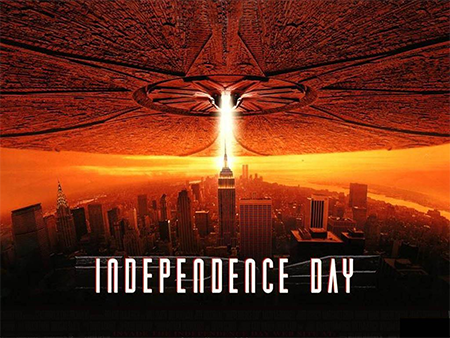 Une immense soucoupe volante envahit le ciel terrestre, libérant un nombre infini de plus petites soucoupes qui prennent position au-dessus des plus grandes villes du monde.
